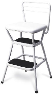 24"H, foam-cushioned, contoured seat lifts out of way for step up convenience. Two 9-1/2" and 17-1/2" high molded safety tread steel steps. Seat lifts up for easy access to steps. Stable chromed steel frame and contoured back, baked-on enamel trim. Protective leg tips .